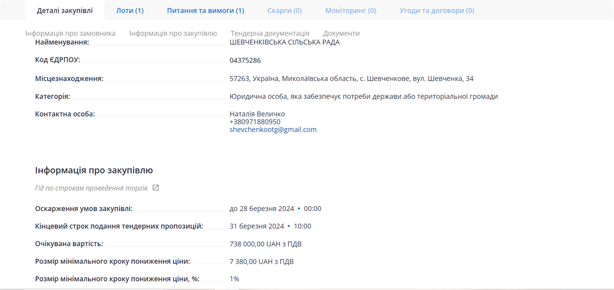 Про це стало відомо завдяки сайту публічних закупівель Prozorro.