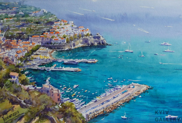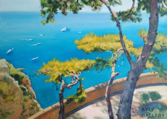 Київський художник показує море як прекрасну, могутню, безтурботну стихію, залиту сонцем – чи то Капрі, чи Судак. Яскраві, насичені кольори, відсилки до Гогена й Матіса. Природа і вода – головні герої, люди й судна – лише стафаж.