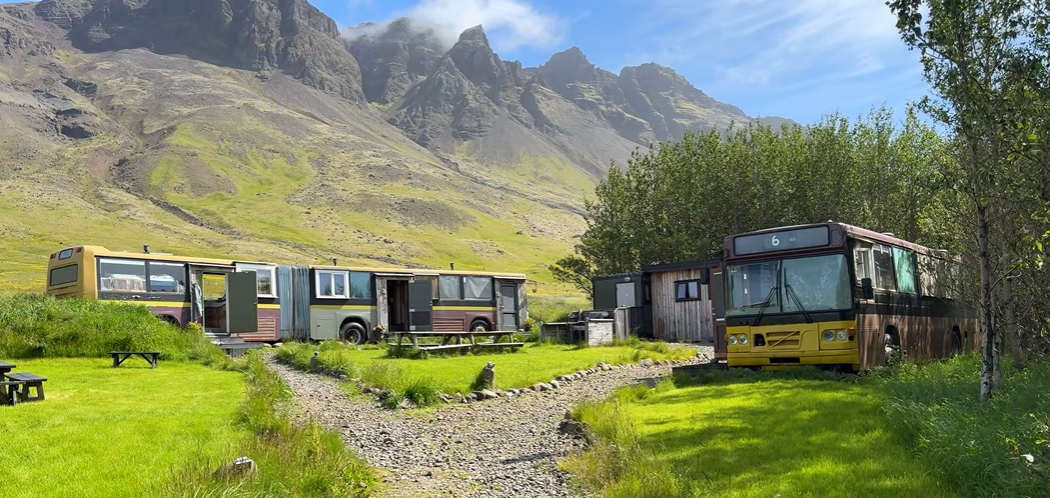 Забудьте про звичайні готелі. Уявіть, що ви ночуєте в справжньому автобусі, який стоїть самотньо серед ісландських гір. Зовні — автобус, всередині — затишний вагон-купе з повноцінною кухнею, холодильником, електроплитою і навіть посудом.