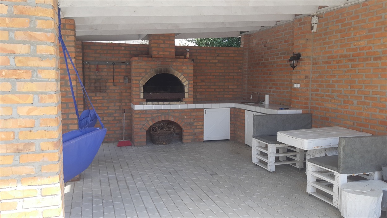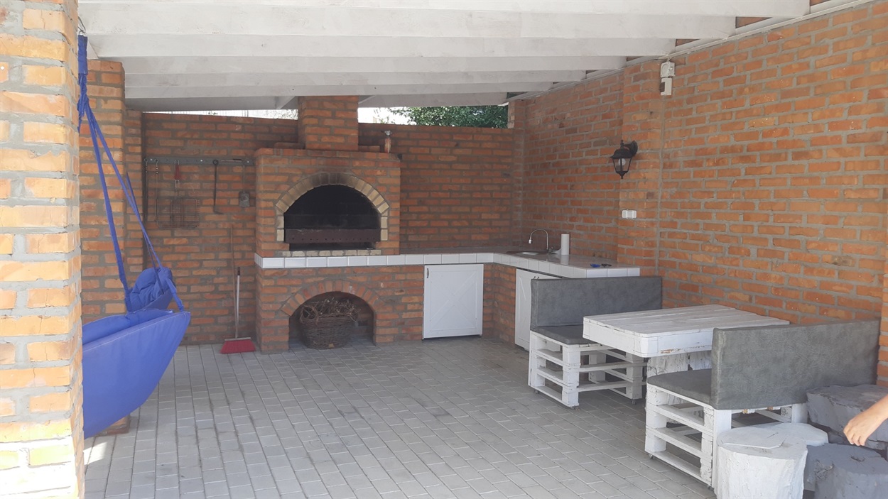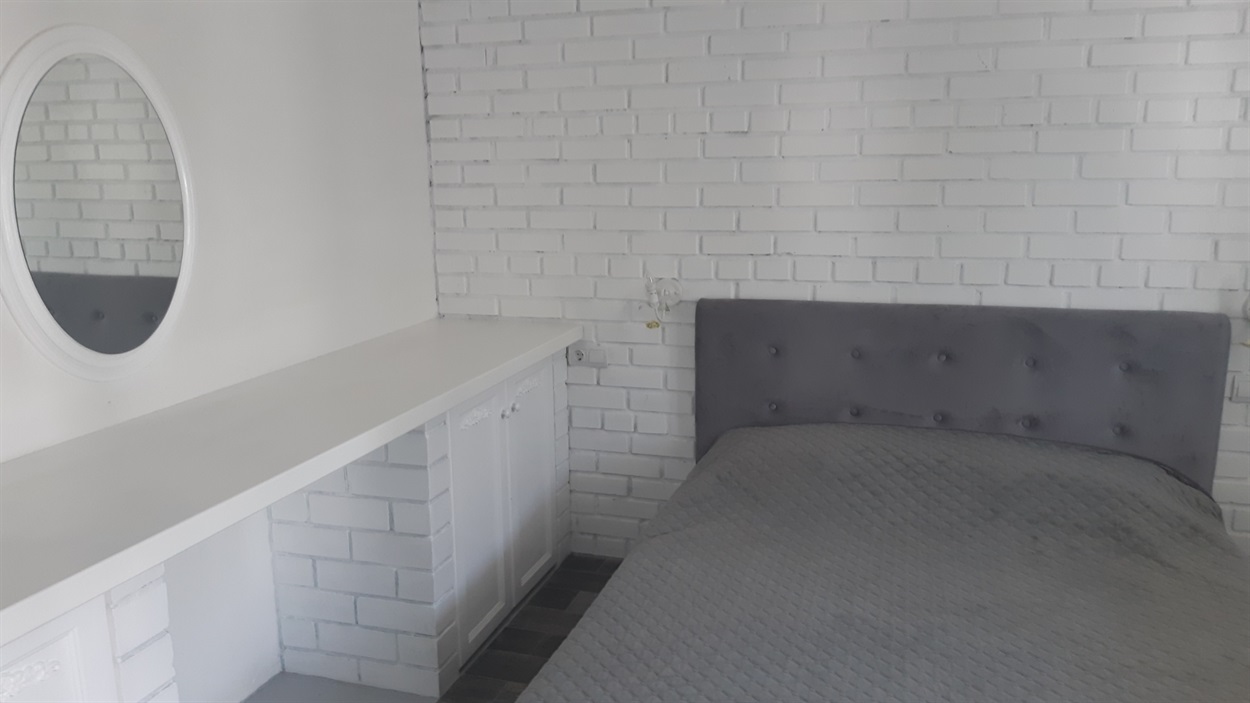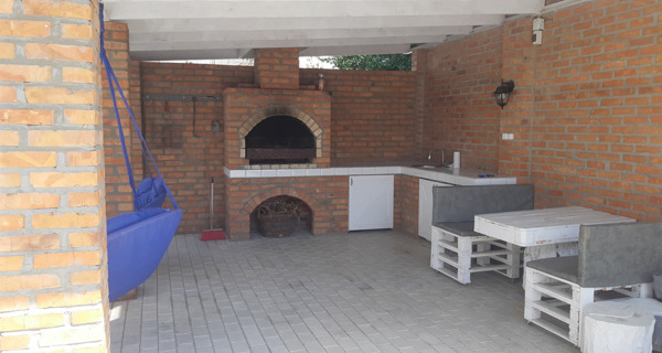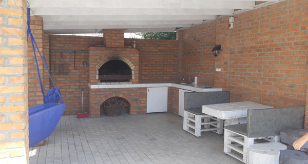 В первой спальне: двуспальная кровать, столик и зеркало. Во второй спальне: двуспальная кровать и двухуровневая кровать. В кухне есть вся необходимая посуда, плита, микроволновка, стол на шесть человек. Во дворе обустроена мангальная зона с камином и беседкой. Есть детская площадка.