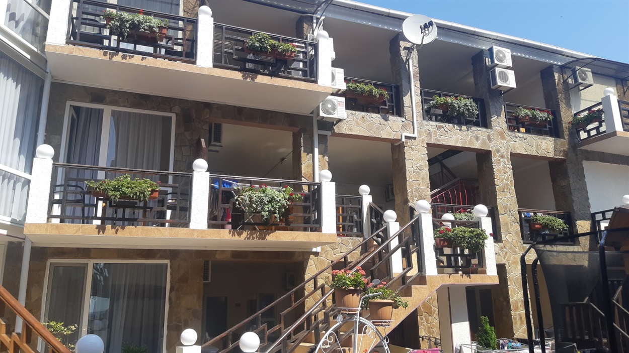 2-комнатный, 3-местный номер - 2 спальни (двуспальная кровать, диван, кондиционер, 2 спутниковое ТВ , холодильник, электрочайник, столовый и чайный сервиз, санузел (душ, унитаз, умывальник, фен, количество полотенец – 2 на человека). 2 балкона с видом на море.