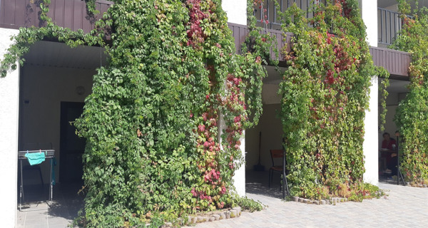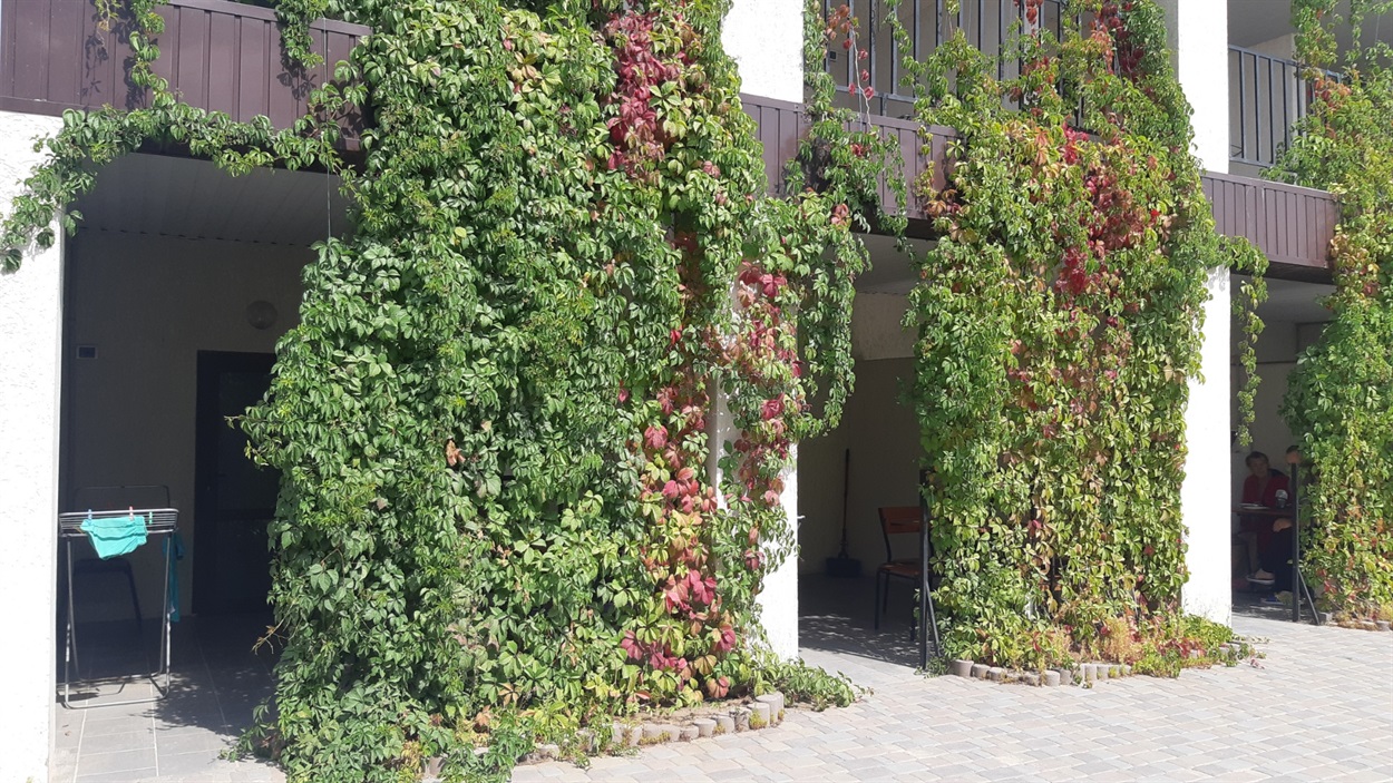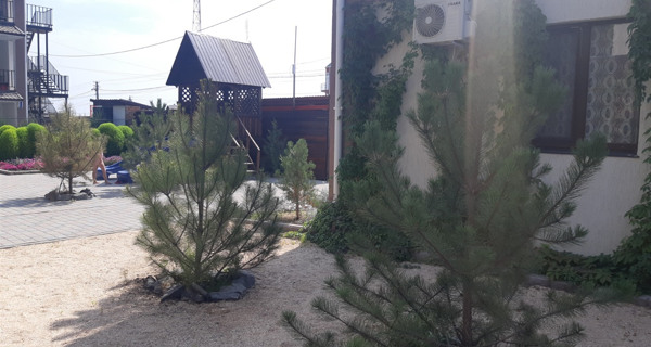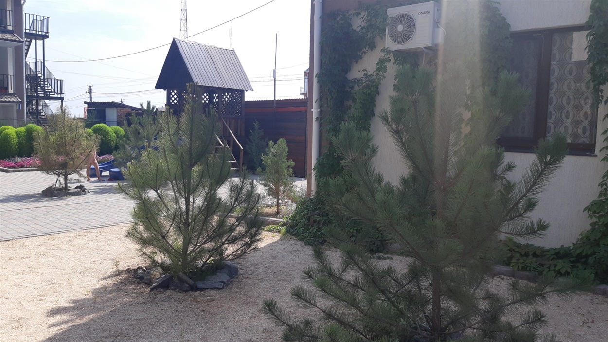 На территории есть небольшой бассейн 8*4 метра, парковка и один трехэтажный жилой корпус, в котором расположены однокомнатные номера "Стандарт" на 4 человек. Каждый номер оборудован индивидуальной кухней на балконе. Из номеров открывается вид на Азовское море.