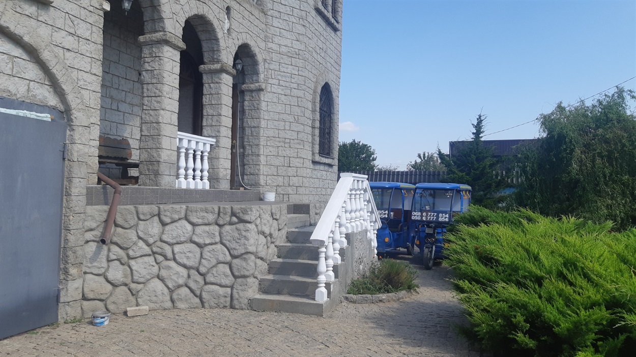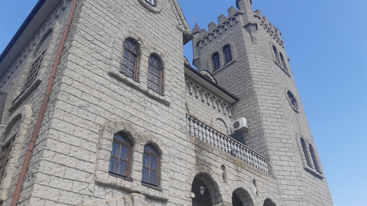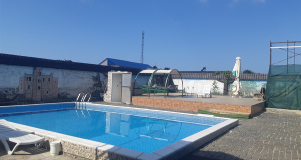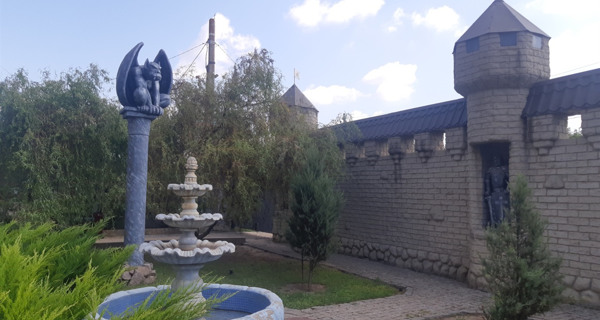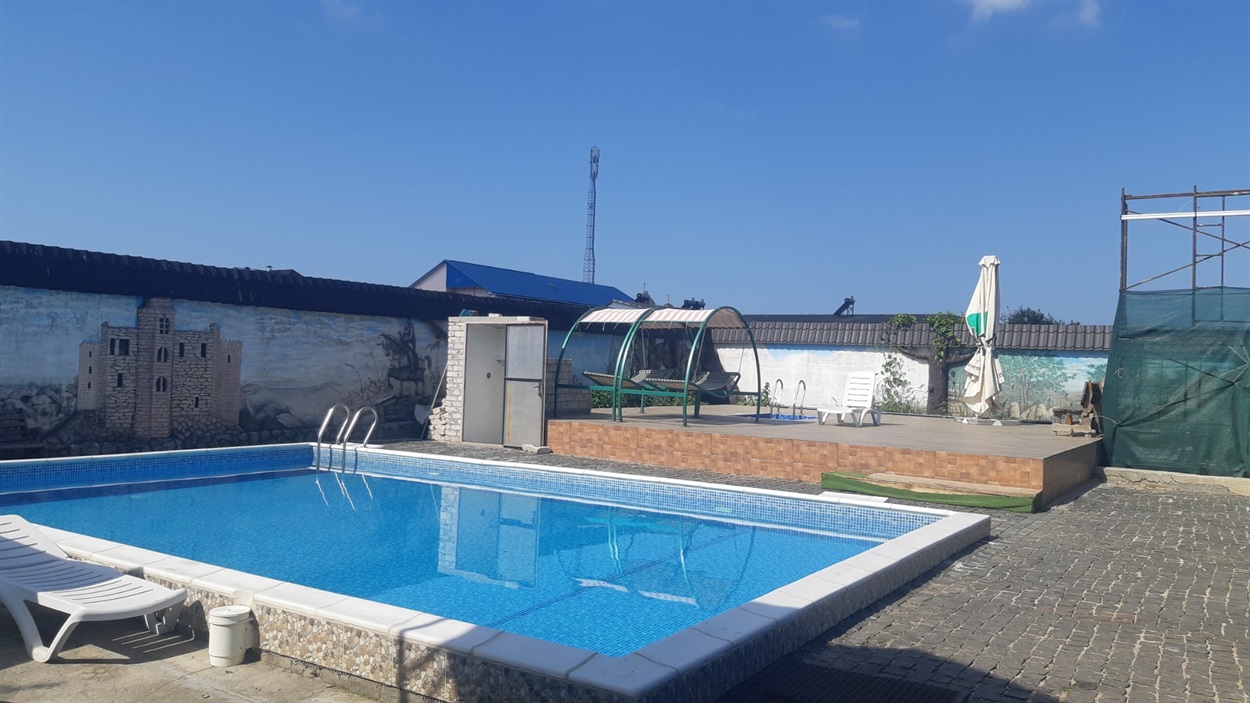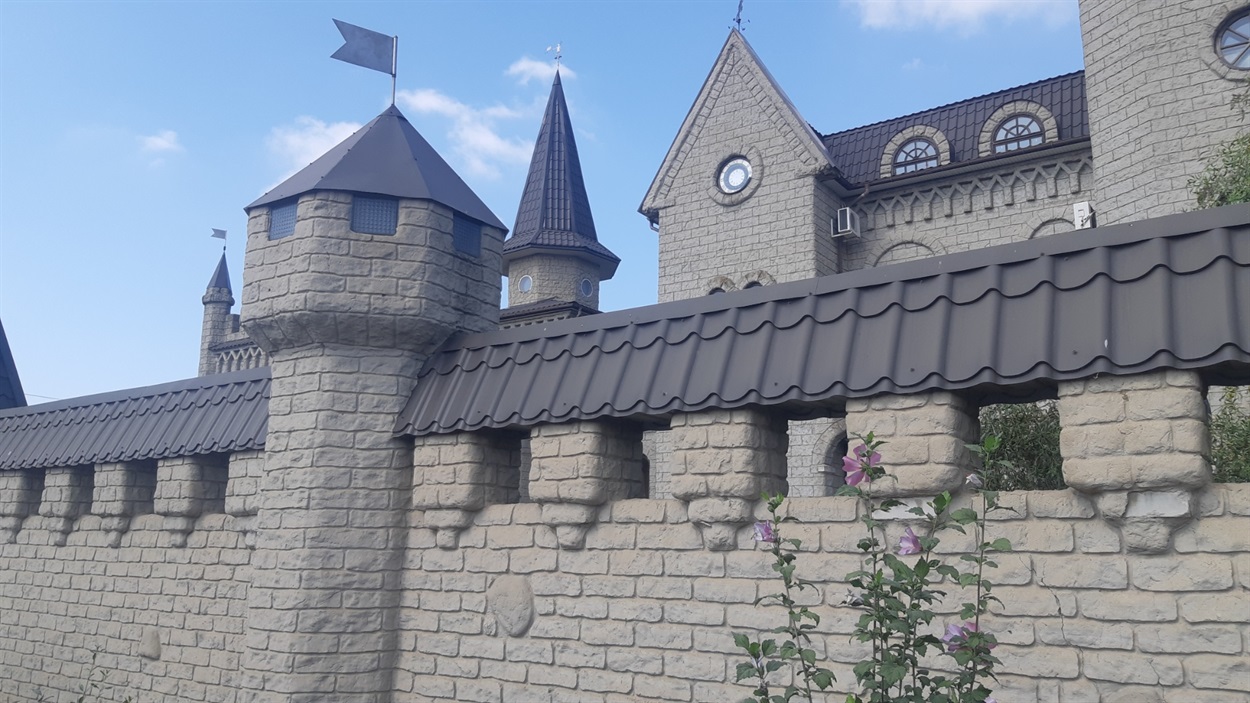 На территории есть кухня, парковка, стационарный бассейн 9х6, шезлонги, уютные беседки, мангал, бильярд, теннисный стол, спортивный зал, летний кинотеатр. Есть смотровая площадка на башне замка. Доставка на море электрорикшей по льготной цене.