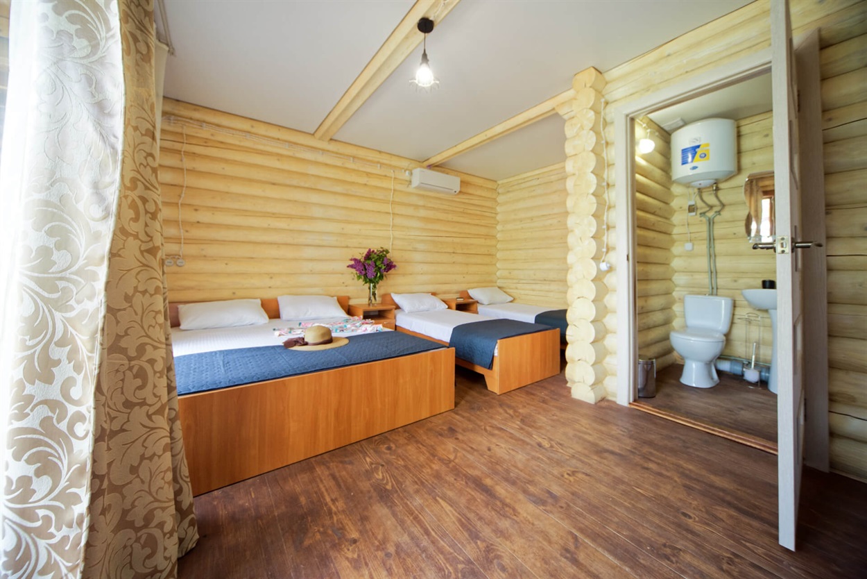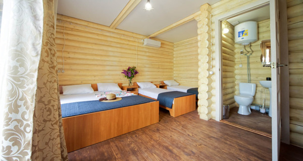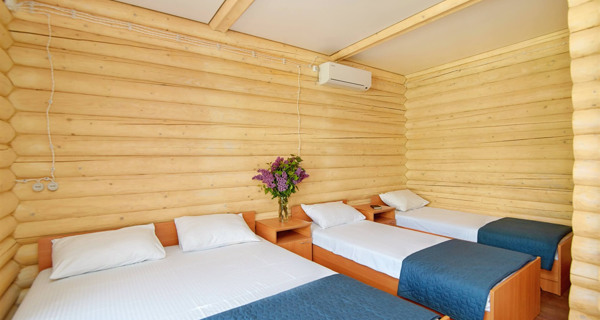 На базе отдыха есть 5 деревянных домиков, в каждом из которых 8 комнат. Вы сможете выбрать среди двух-, трех- и четырехместных номеров.