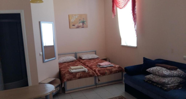 1-комнатный номер полулюкс с лоджией с видом на море в сезон 750-1150. Номера с большой лоджией с видом на море. 2 кровати или большой раскладывающийся диван. Есть кондиционер, набор минипарфюмерии. На лоджии по желанию гостей, устанавливается дополнительный столик со стульями.